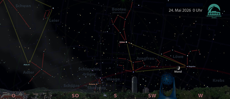 Frühlingsanfang, 2 Planeten und Beginn der Sommerzeit Am 20. März um 15:47 Uhr bewegt sich von Jena aus gesehen der Mittelpunkt der Sonnenscheibe durch den Frühlingspunkt vor dem Sternbild Fische. Die Länge des hellen Tages nimmt nun deutlich zu. Rund 39 Grad Höhe über dem Horizont erreicht die Sonne hier in Jena, der lichthelle Tag […]