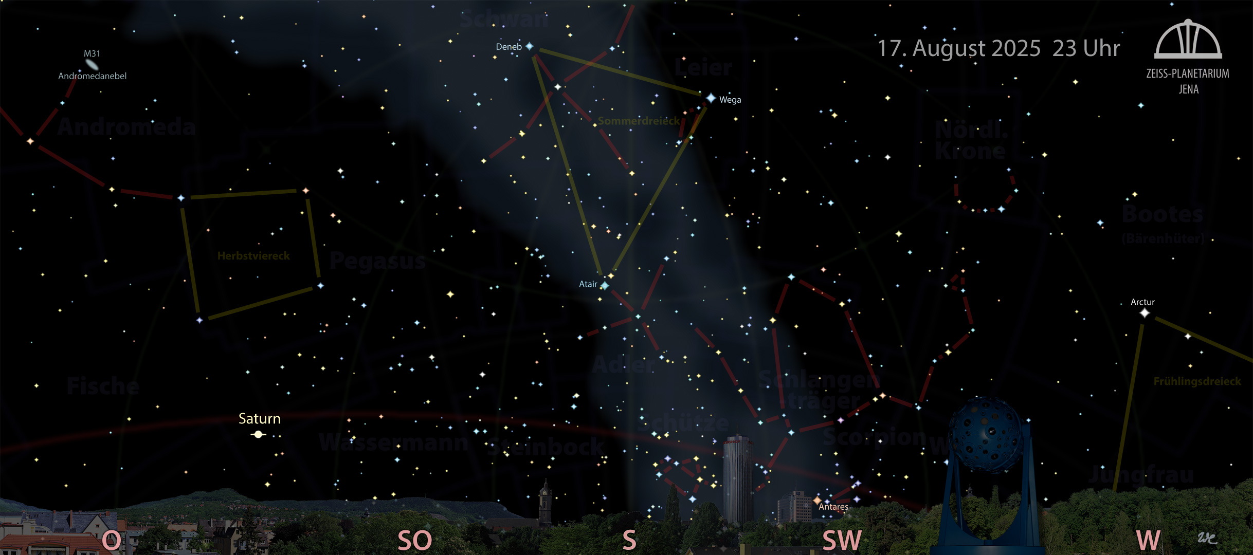 Die Hochsommernächte werden vom Sommerdreieck beherrscht. Hoch im Süden funkeln mit Deneb im Schwan und Wega in der Leier zwei der hellsten Sterne am irdischen Himmel. Unter ihnen vollendet der Atair im Adler das prachtvolle Dreieck. Das Sternbild Schwan ist auch als Kreuz des Nordens gut zu finden. In einer ganz klaren Nacht kann man sich gut vorstellen, wie beide Vögel mit ausgebreiteten Schwingen über das matt schimmernde Band der Milchstraße zu gleiten scheinen. Aber dafür sind schon sehr gute Sichtbedingungen erforderlich. Vier nicht sehr lichtstarke Sternchen, die ein kleines Parallelogramm bilden, formen zusammen mit der Wega das Sternbild Leier. Flach über dem Südhorizont sind die sommerlichen Tierkreissternbilder Waage, Skorpion, Schlangenträger, Schütze und Steinbock zu finden. Der rötlich funkelnde Stern Antares des Skorpions ist recht gut auszumachen.