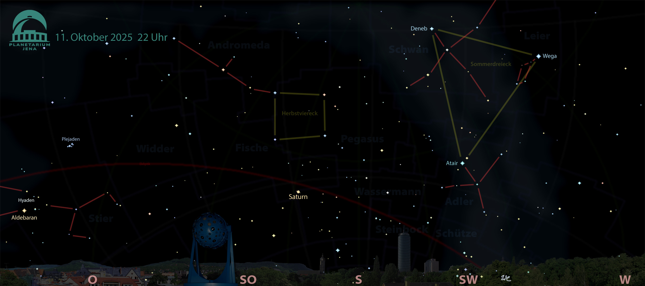 Die frühen Nachtstunden dokumentieren den Abschied vom Sommer, das Sommerdreieck ist bereits im Südwesten zu finden. Der Deneb im Sternbild Schwan, die Wega in der Leier – beide stehen sehr hoch – und der Atair unten bilden dieses gleichschenklige Dreieck. Südlich folgen die weniger hellen Sterne des Herbstvierecks, das aus Sternen der Sternbilder Pegasus und Andromeda besteht. Deren Sternkette weist in den Osten.