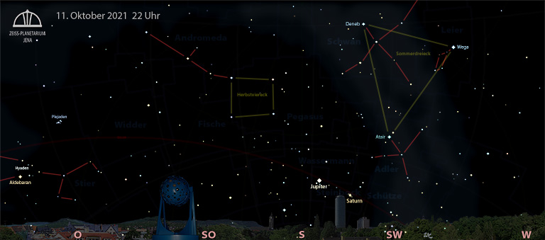Die frühen Nachtstunden dokumentieren den Abschied vom Sommer, das Sommerdreieck ist bereits im Südwesten zu finden. Der Deneb im Sternbild Schwan, die Wega in der Leier – beide stehen sehr hoch – und der Atair unten bilden dieses gleichschenklige Dreieck. Südlich folgen die weniger hellen Sterne des Herbstvierecks, das aus Sternen der Sternbilder Pegasus und Andromeda besteht. Deren Sternkette weist in den Osten.