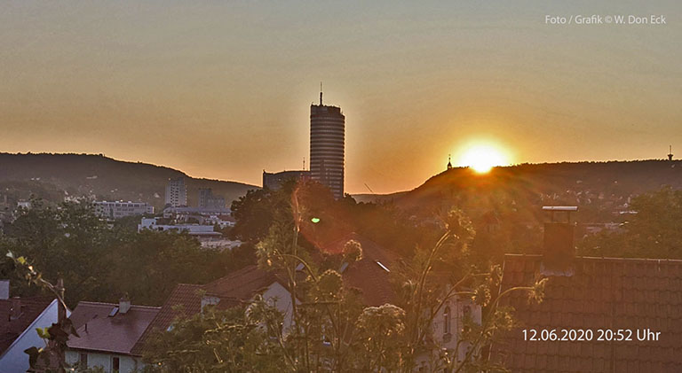Die Sonne des ersten Sommertages des Jahr 2021 strahlte zur Mittagsstunde am 21. Juni, dem Tag der Sommersonnenwende 2021. Um 5 Uhr 32 berührte die Mitte der Sonnenscheibe vor dem Tierkreissternbild Stier den Wendekreis des antiken Tierkreiszeichens Krebs. Nun nahm die Mittagshöhe leider wieder ab. Und damit auch die Länge des hellen Tages. Zunächst jedoch ganz langsam und kaum merklich. Der Sonnenuntergangspunkt verschob sich nun wieder in Richtung Osten (links). Ähnlich war es auch schon in den Wochen zuvor. Bereits im Mai war der helle Tag lang. Zu Mitternacht stand die Sonne nur etwa 16 Grad unterhalb des Nordhorizonts. Das bedeutete, daß das Ende der astronomischen Dämmerung in unseren Breiten nicht ganz erreicht wurde, die Nacht nicht völlig dunkel wurde. Im hohen Norden führte das zu den „Weißen Nächten“ und nördlich des Polarkreises zur „Mitternachtssonne“.